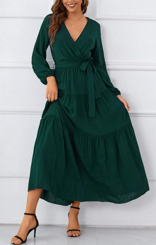 Womens V Neck Long Sleeve Casual a Line Tiered Fall Vintage Party Midi Long Maxi Dress with Belt